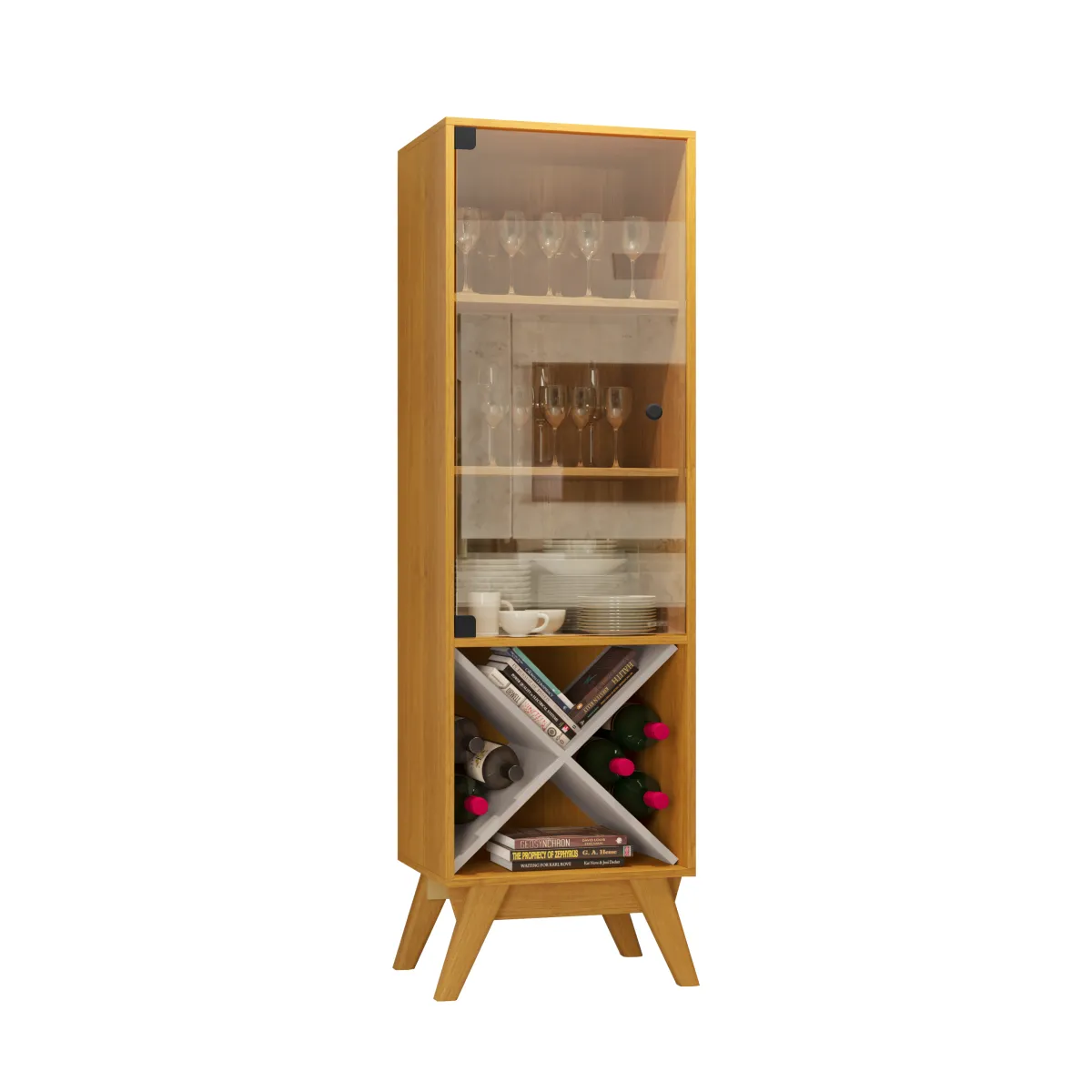 La Cristalera Graca es un mueble de estilo retro, ideal para salas de estar o comedores, producido en MDP de 15mm con patas de madera maciza. Cuenta con una puerta de vidrio templado, adega decorativa y ofrece un diseño funcional y elegante para organizar y exhibir objetos.