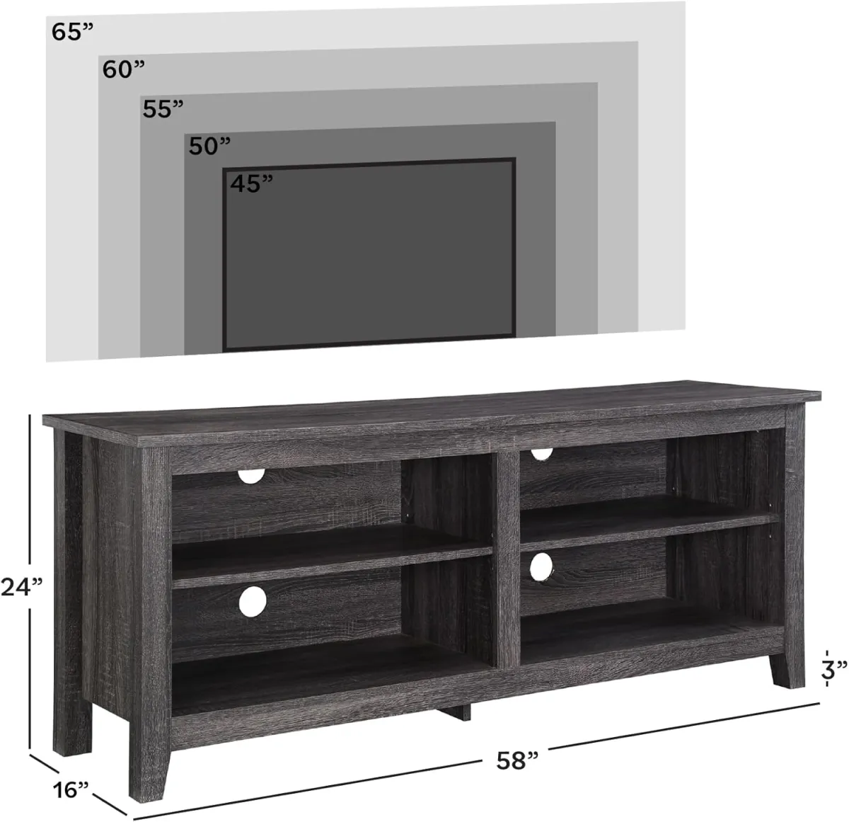 Dimensiones: 23.37 pulgadas de alto x 15.75 pulgadas de profundidad x 58 pulgadas de largo; casillero de almacenamiento abierto: 15.75 pulgadas de alto x 14 pulgadas de profundidad x 25.25 pulgadas de largo.