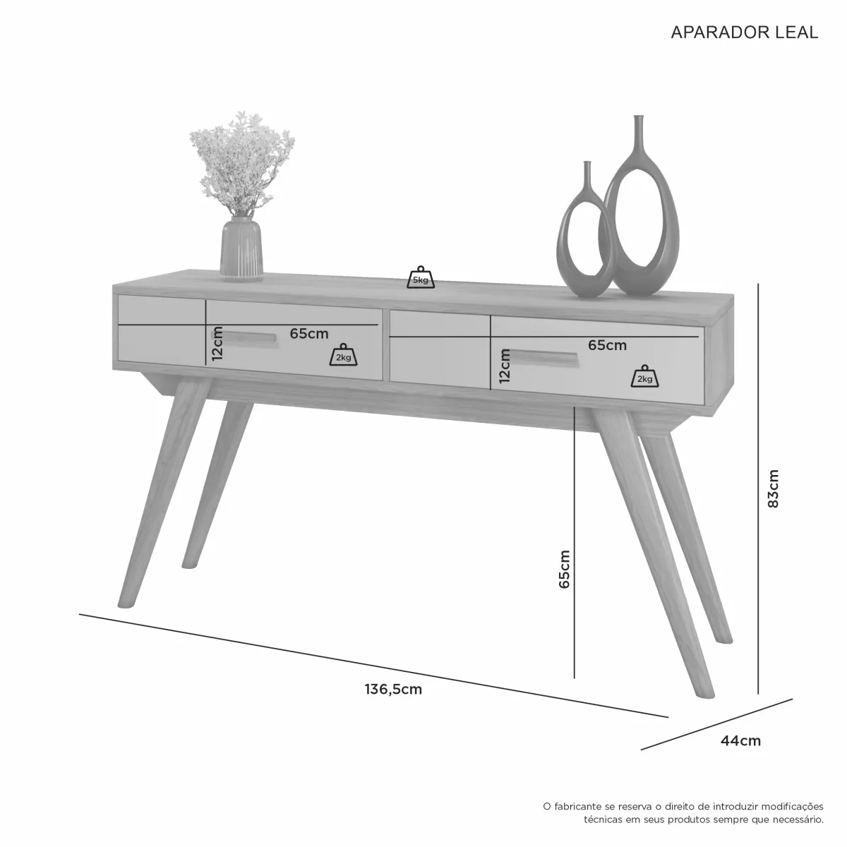 El aparador Leal es una pieza versátil y de diseño retro-moderno, ideal para salas de estar, comedores o recibidores. Fabricado en MDP con acabado amaderado, cuenta con dos cajones, patas de madera maciza, y unas dimensiones aproximadas de 136,5 cm de ancho, ofreciendo estilo y funcionalidad para organizar y decorar.